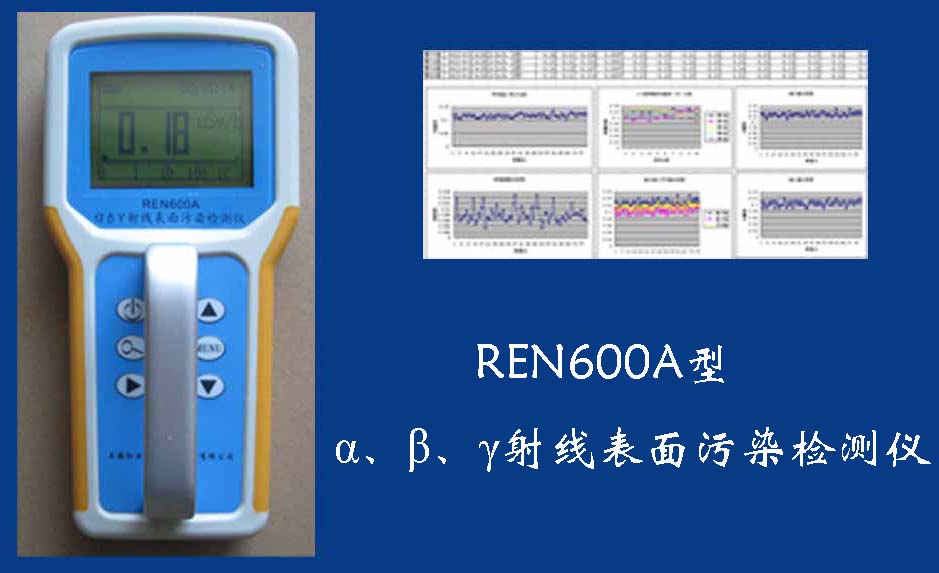 REN600A型α、β、γ射線表面污染檢測儀即可檢測α、β、γ射線,也能檢測到X射線,它采用高速嵌入式微處器作為數據處理單元,點陣式大屏幕LCD液晶顯示,讀數清晰、操作方便,具有400條超大容量數據存儲。儀器采用進口的大面積MICA蓋革探測器,具有較高探測效率,可進行α、β輻射表面污染檢測和X、γ輻射劑量率的監(jiān)測。此外通過配套的RenriCont表面污染管理軟件可將存儲的數據讀出后分析。可廣泛用在制藥廠、實驗室、發(fā)電廠、進出口商檢、采石場、環(huán)境實驗室、環(huán)境污染調查、核安全應急、緊急狀況營救站、金屬處理廠、地下油田、供油管道裝備、醫(yī)院核醫(yī)學科、同位素實驗室、環(huán)境保護和警察局等部門。REN600A型α、β、γ射線表面